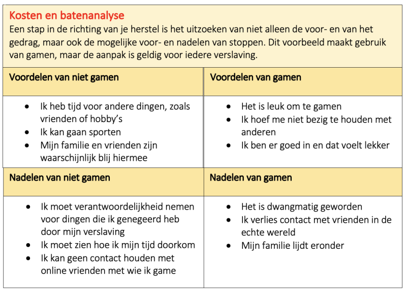 Om je te helpen bij het doorzien van de problemen die de verslaving met zich meebrengt, kan je een soort kosten-batenanalyse maken. Hierin zoek je niet alleen de voor- en nadelen van de verslaving uit, maar ook de mogelijke voor- en nadelen van stoppen. Het geeft meestal onverwachtse inzichten voor degene die het invult. Het voorbeeld hieronder is gericht op dwangmatig gamen, maar je kan het doen met elke verslaving.