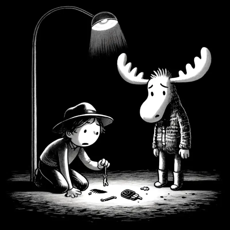 Hij besluit zijn vriend te helpen en samen zoeken ze verder. Na een half uur zegt hij: "Hier liggen ze echt niet, weet je zeker dat je ze hier bent verloren?"